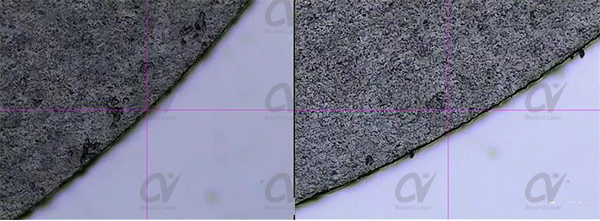 切割結(jié)果及分析:從切割樣件照片可以看出:1. 顯微鏡上看切割后的藍(lán)寶石邊緣光滑、基本無掛渣、無毛刺;2. 切割面幾乎無坡度,錐度在100以內(nèi);3. 藍(lán)寶石正面切割邊緣效果較好,崩邊尺寸的崩變量較背面崩邊尺寸小,背面崩邊量也控制在10μm以下。